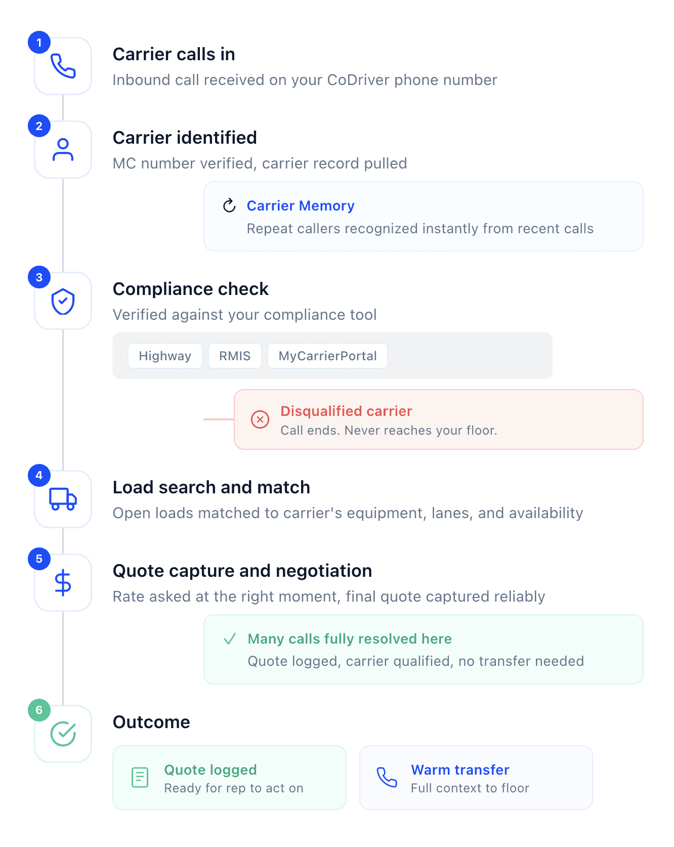 Full automation: Qualification, load search, quoting, and negotiation, all handled by CoDriver before the call reaches your team.