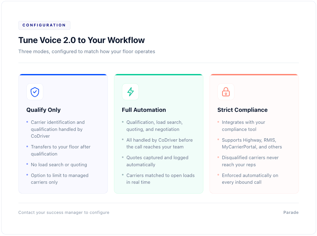Qualify only: CoDriver handles carrier identification and qualification, then transfers to your floor. No load search, no quoting. Can be configured for managed carriers only.