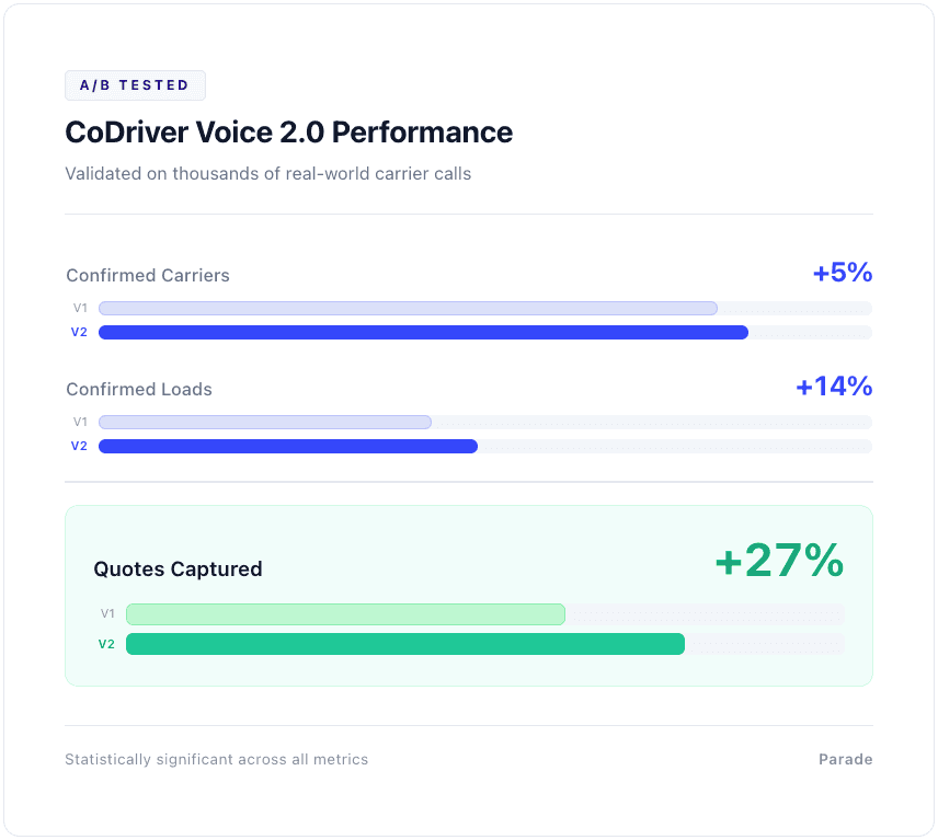 Today, we're announcing CoDriver Voice 2.0, a complete rebuild of our Voice AI agent. Not a feature update. Not a patch. A ground-up rebuild designed to turn more carrier phone calls into quotes, and more quotes into covered loads.